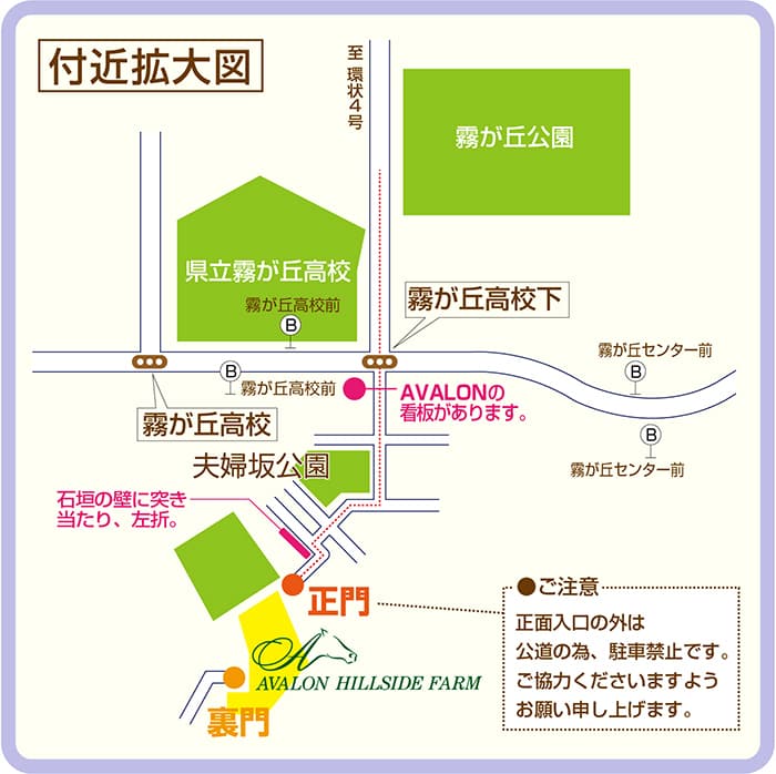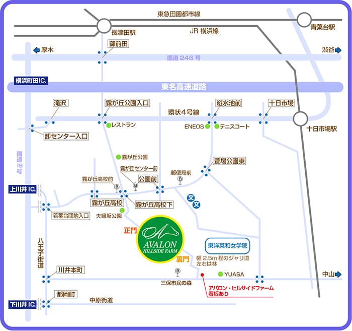 - ▷「横浜町田インター」料金所を出て左「横須賀・横浜」方面に入り右車線へ。すぐ右方向の「上川井」方面・国道16号へ。最初の「卸センター」信号を左折。すぐの信号「滝沢」を右折、環状4号を直進し「霧が丘公園入口」信号を右折して到着